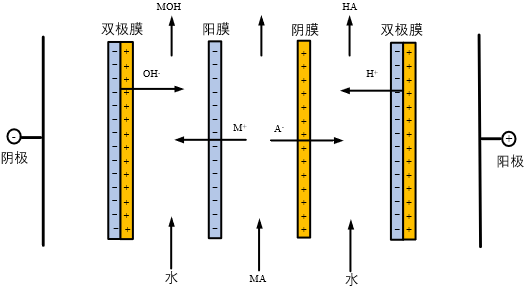 包括三隔室雙極膜電滲析器和二隔室雙極膜電滲析器兩種;三隔室雙極膜電滲析器適用于將無(wú)機(jī)鹽轉(zhuǎn)化為對(duì)應(yīng)酸和堿,膜對(duì)由雙極膜、陽(yáng)離子交換膜和陰離子交換膜組成,包含鹽室、酸室和堿室;二隔室雙極膜電滲析器適用于將有機(jī)酸鹽轉(zhuǎn)化為有機(jī)酸和堿或?qū)⒂袡C(jī)堿鹽轉(zhuǎn)化為有機(jī)堿和酸,膜對(duì)由雙極膜和陽(yáng)離子交換膜(包含料室和堿室)或雙極膜和陰離子交換膜(包含料室和酸室)。 雙極膜電滲析過(guò)程以電場(chǎng)為驅(qū)動(dòng)力,利用雙極膜解離水為H+和OH-的特性,將雙極膜與陰、陽(yáng)離子交換膜組合成雙極膜電滲析系統(tǒng), 實(shí)現(xiàn)將鹽溶液轉(zhuǎn)化為對(duì)應(yīng)的酸和堿;該過(guò)程僅在電極室設(shè)置電極,僅在電極室產(chǎn)生氣體,運(yùn)行能耗較低;該過(guò)程除電極室外,沒(méi)有電極反應(yīng),沒(méi)有氧化還原反應(yīng),不會(huì)產(chǎn)生目的物以外的物質(zhì)。