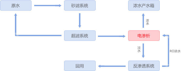 氧氯化鋯和碳酸鋯生產(chǎn)工藝產(chǎn)生的高含鹽廢水,采用均相膜電滲析裝置和反滲透耦合聯(lián)用,對該高鹽廢水進(jìn)行處理,可將鹽水濃縮到18%以上進(jìn)MVR蒸發(fā),淡水經(jīng)反滲透制得純水回用,解決了高鹽水的排放問題。 工藝流程