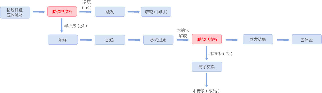 粘膠纖維生產(chǎn)過程中產(chǎn)生大量壓榨廢堿液,以前轉(zhuǎn)移到污水處理廠用酸中和,不僅產(chǎn)生大量固廢,而且造成資源浪費(fèi)。采用均相膜電滲析裝置,壓榨堿液經(jīng)電滲析脫堿回用,脫堿后的半纖經(jīng)酸解、電滲析脫鹽凈化后生產(chǎn)木糖,該工藝是工業(yè)廢棄物資源化利用并實(shí)現(xiàn)廢水零排放的典型案例。該項(xiàng)目已連續(xù)運(yùn)行兩年,全年可實(shí)現(xiàn)20萬噸高含量半纖維素堿法漿處理回用,對傳統(tǒng)產(chǎn)業(yè)工藝綠色化改造具有重要意義。 工藝流程