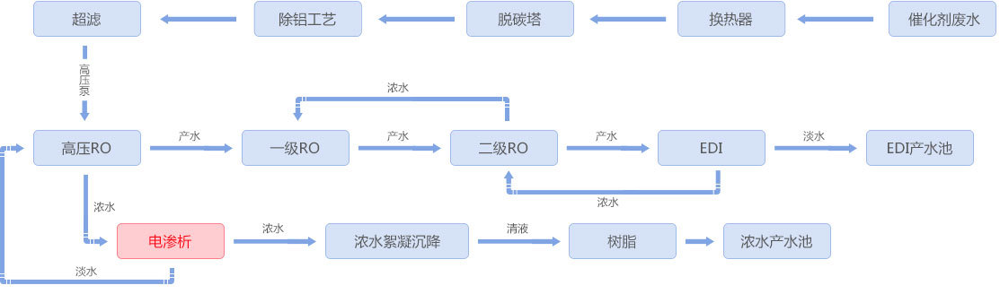 煉油催化劑生產(chǎn)過程中產(chǎn)生3%左右的硝酸銨廢水,采用均相膜電滲析裝置進(jìn)行濃縮淡化,濃水硝酸銨濃度達(dá)到20%后進(jìn)入蒸發(fā)系統(tǒng),電滲析淡水經(jīng)反滲透處理后回用,實(shí)現(xiàn)含硝酸銨廢水資源化利用及零排放。 工藝流程
