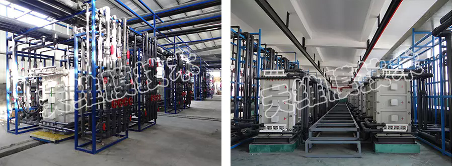 阻燃劑生產(chǎn)過程中產(chǎn)生低濃度含溴化鈉廢水,采用均相膜電滲析裝置,可將廢水中溴化鈉含量由1.5%濃縮至15%以上,然后再進(jìn)入蒸發(fā)裝置回收溴化鈉進(jìn)行銷售,產(chǎn)出的淡水含鹽量降至0.1%可直接返回工藝循環(huán)利用。該工藝既降低了廢水處理成本,又實(shí)現(xiàn)了廢棄物的資源化回收利用。 項(xiàng)目現(xiàn)場