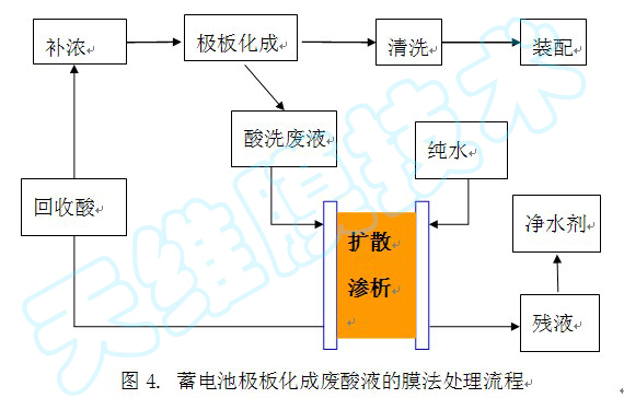 極板化成之后的廢酸由于酸洗極板之后廢酸中鐵離子含量增加。如果重復(fù)使用由于鐵離子的存在會與負電極形成腐蝕微電池,引起負極金屬溶解;電解液廢酸中鐵離子含量高則引起電池的自放電使電池容量減少,降低電池使用壽命。用擴散滲析法回收處理電解液廢酸和化成廢酸,鐵離子截留率在90%以上。